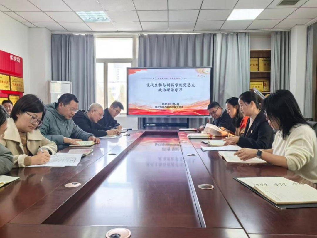 2025年11月4日下午,现代生物与制药学院党总支在办公楼301党员活动室开展政治理论学习。会议由党总支书记梁艳主持,院长王湘妍及全体教职工参加学习。