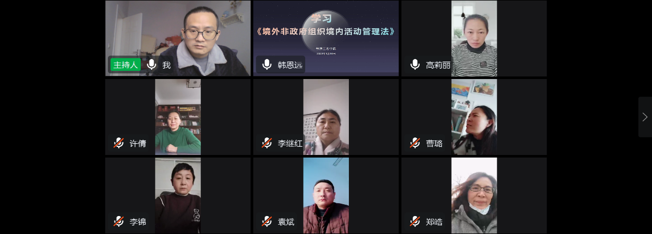 为进一步提升教职工对《境外非政府组织境内活动管理法》的知晓率,增强普法宣传,强化教师安全防范能力,积极响应国家有关境外非政府组织管理各项工作,2022年1月10日下午永利集团3044欢迎光临组织全体教职工利用钉钉网络平台,线上开展《中华人民共和国境外非政府组织境内活动管理法》实施五周年普法学习宣传活动。活动由院长韩恩远主持。