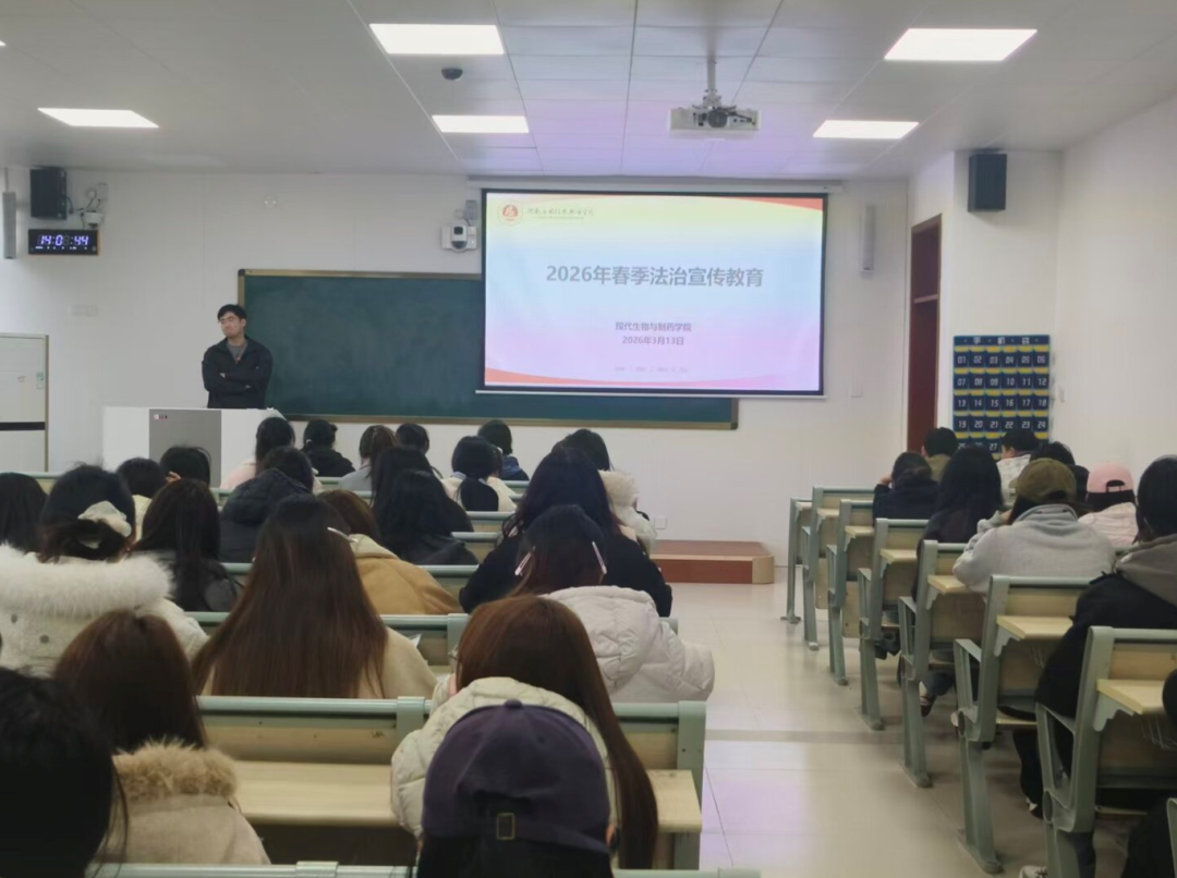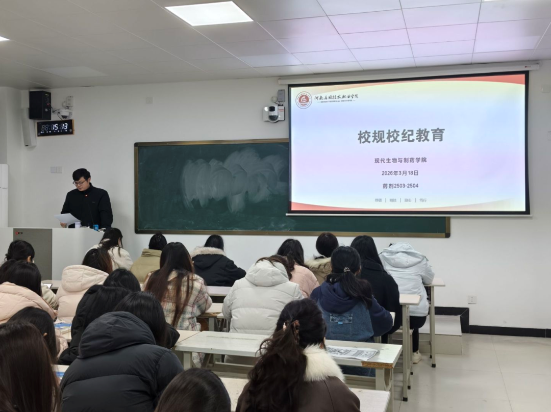 为进一步强化学生法治意识,规范日常行为,营造安全、文明、有序的校园育人环境,现代生物与制药学院组织各班召开校规校纪教育主题班会。